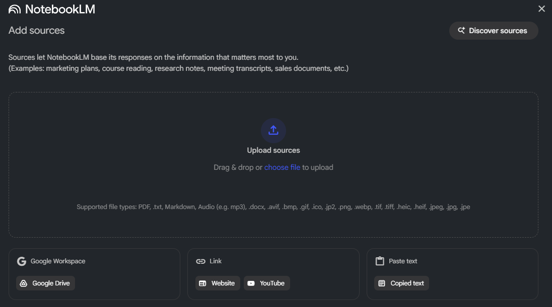 - Your Task: Create a new notebook in NotebookLM and upload 3-5 credible sources (PDFs, web articles, textbook chapters) on your chosen topic.