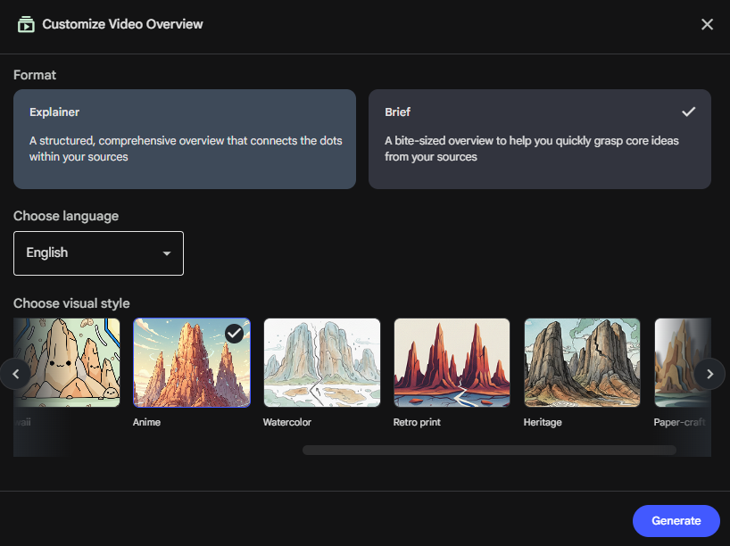 - Generate an Video Overview in “Explainer” or “Brief” mode. Watch the AI presentation to learn about the topic.
